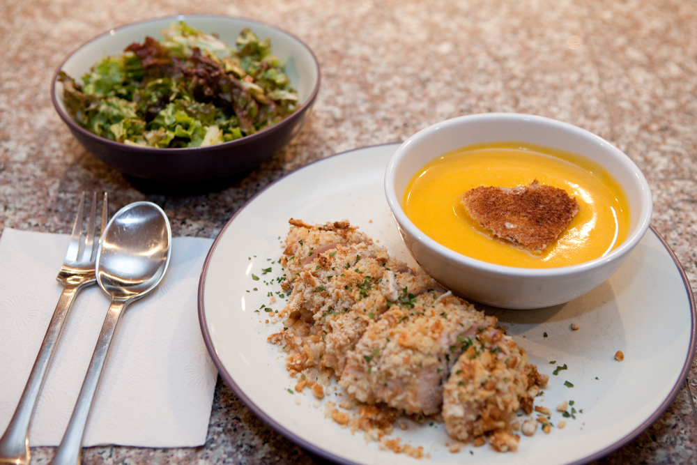 I used Giada De Laurentiis’ Butternut Squash Soup recipe… I still had some leftover squash from our mac and cheese last week. Instead of the fontina cheese crostini, I just toasted some wheat bread and melted a bit of brie on top (yes… still trying to use up the brie too!) I put the brie side down in the soup for presentation purposes.
