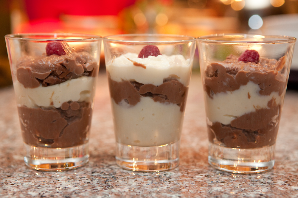 For the parfaits, I used this chocolate pudding recipe and this vanilla pudding recipe and layered the two in a little cup placing a raspberry on top. As you can see, they aren’t “picture perfect” but they were tasty!