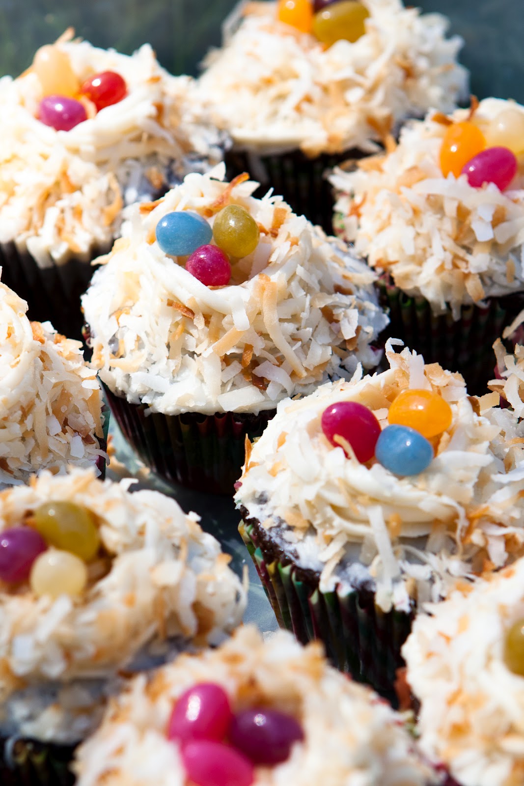Simply pick your favorite chocolate cake recipe and bake the cupcakes, cool. Then make your favorite vanilla butter creme frosting. I used this one (except I used milk instead of cream). Spread a thin layer of frosting on each cupcake then pipe a circle on each about 1/4-1/2 inch tall. Top with toasted coconut and place 3 jellybeans in each “nest” (I use the Trader Joe’s- they use natural colors!).