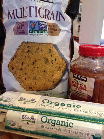 Place the tortilla chips in one half of a pan and cover with salsa.